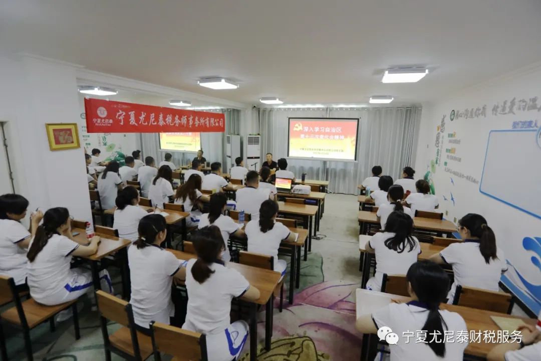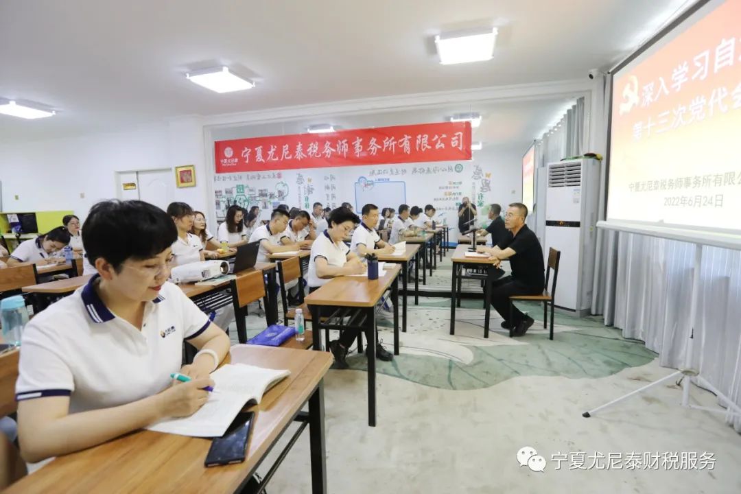 这次培训活动公司还专门邀请宁夏注册税务师协会会长、党委副书记、宁夏尤尼泰税务师事务所有限公司党建指导员毛宏业带领大家深入学习领会自治区第十三次党代会精神。大家纷纷表示,要迅速把思想和行动统一到党代会精神上来,充分形成强大合力,助力推动党代会精神在注税行业落地生根、开花结果,以优异的成绩迎接党的二十大胜利召开。